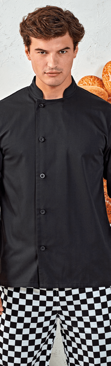 65% poliestere, 35% cotone twill. Giacca da chef resistente a maniche lunghe, chiusura a strappo con 5 bottoni, bottoni in resina di lunga durata, tasca doppia per penne, colletto alla coreana.